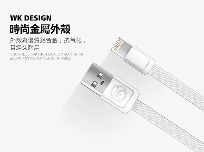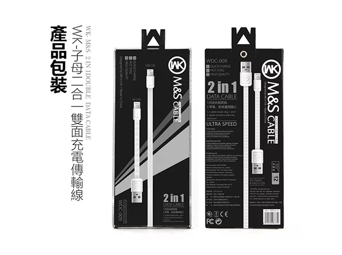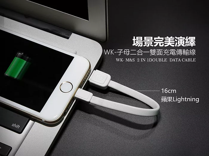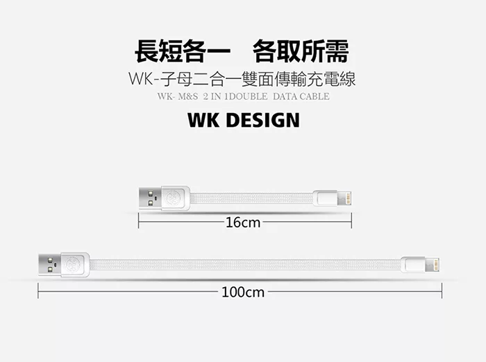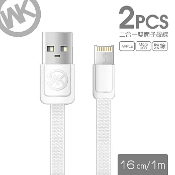 【WK香港潮牌】1M+16CM 2合1子母系列 Lightning-Mirco-USB 充電傳輸線-WDC 009-WT白色![]()