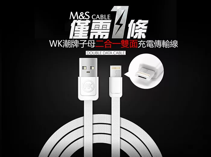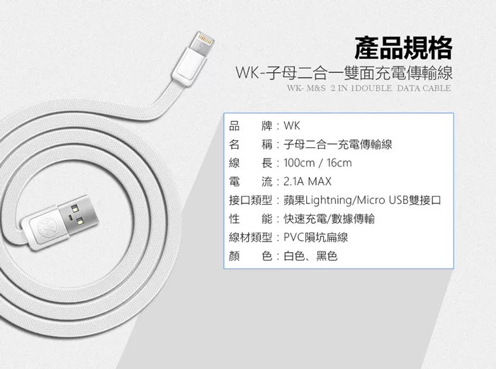 【WK香港潮牌】1M+16CM 2合1子母系列 Lightning-Mirco-USB 充電傳輸線-WDC 009-WT白色 評價